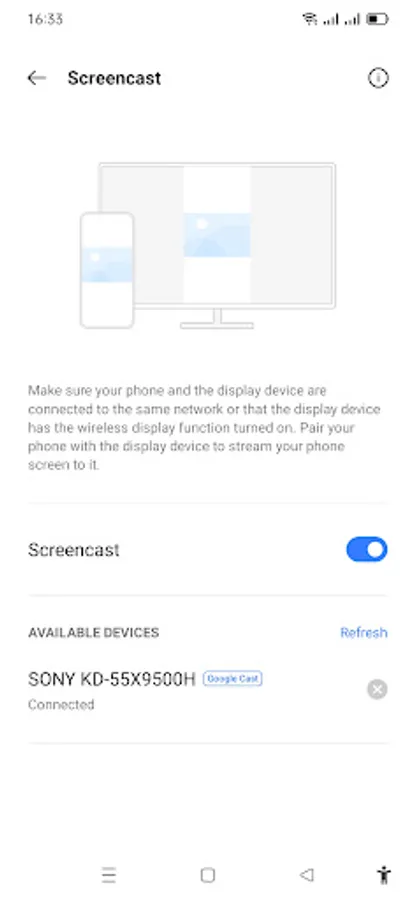 - The status of screen cast is connected. You can play video, photo or audio on your application. Stream to tv from phone is very dependent on Wi-Fi network and streaming device.