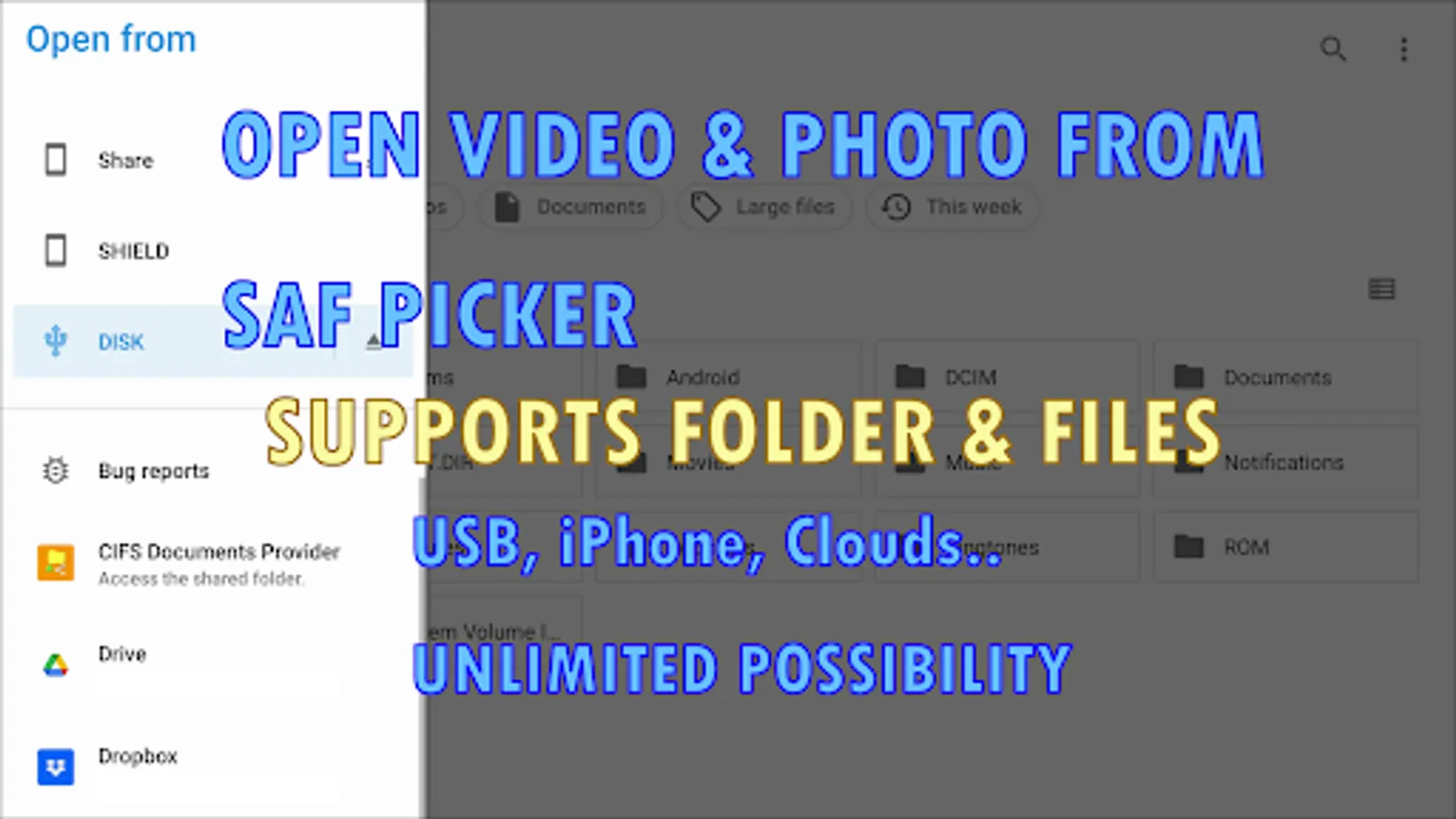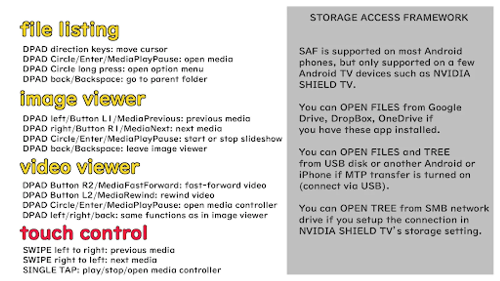 * Support for Storage Access Framework providers on Nvidia Sheild TV and most of the Android phones.