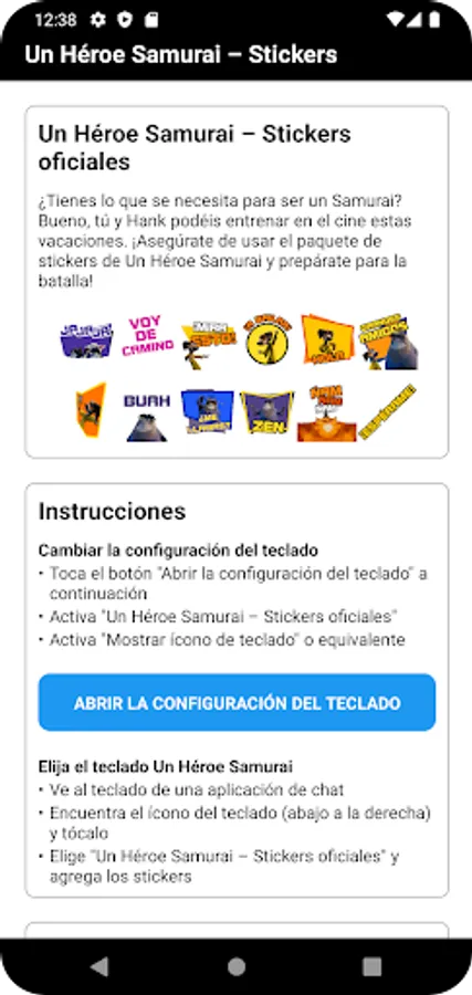 * Sigue las instrucciones de la aplicación para activar el teclado "Un Héroe Samurai – Stickers oficiales" en la configuración.