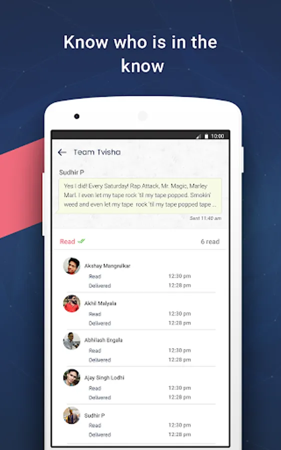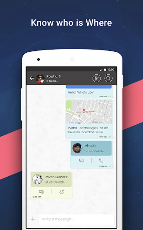 Location and contact sharing- Allows to share your current location with team and boss with team chat app and directly make a call to shared contacts to catch up with your colleagues