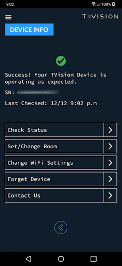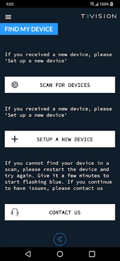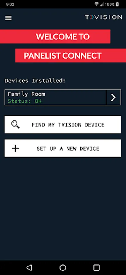 The TVision Panelist Connect app allows you to set up and manage TVision Devices. The app allows TVision Devices to be connected to your home WiFi network. The app also shows you the current status of TVision Devices.
