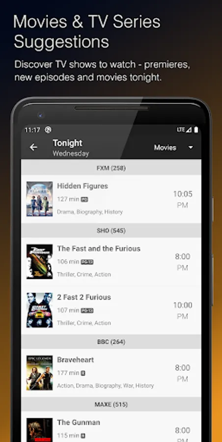 TV Listings and TV Show Guide app also provides suggestions for TV shows and movies in prime time.