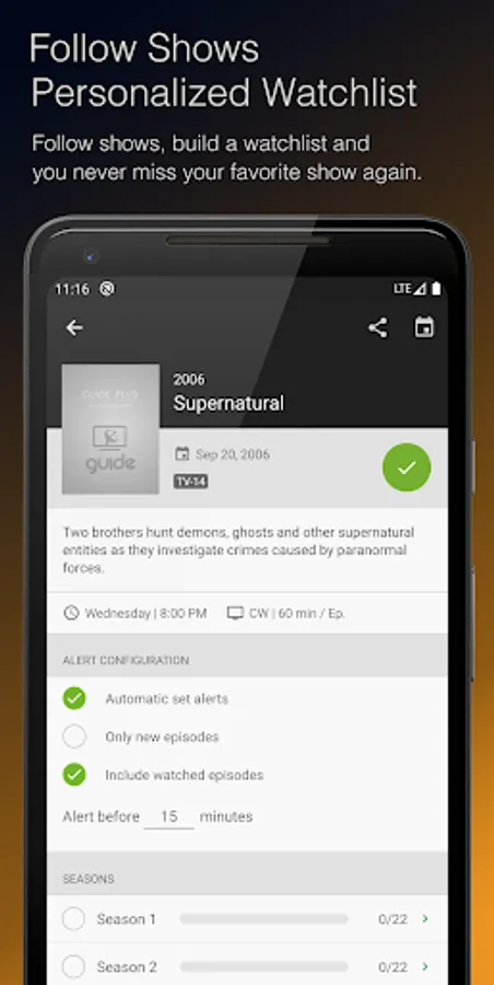 • add shows to watchlist (My Series) and the app will automatically push notification when new episode comes out.