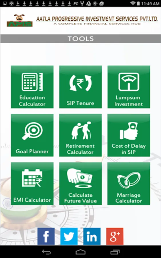 AATLA is a FREE app brought to you by AATLA PROGRESSIVE INVESTMENT SERVICES PRIVATE LIMITED. This FREE App is for Investors to track their Investment Portfolio and know about AATLA PROGRESSIVE INVESTMENT SERVICES PRIVATE LIMITED . Products covered include Mutual Funds & Equity Shares.