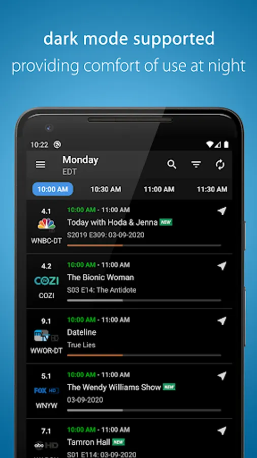 Intelligent synchronizing and caching make ability to work offline in case of temporary internet connection loss, save bandwidth... Help you easy to get TV schedules every time.
