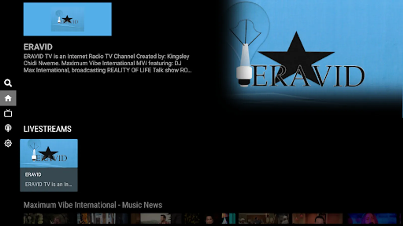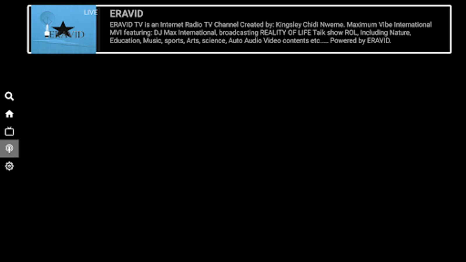 ERAVID is an Internet Radio TV Channel created by Kingsley Chidi Nweme, a.k.a DJ Max International, broadcasting from Maximum Vibe International (MVI) Integrated Studio, presenting REALITY OF LIFE (ROL) Talk show, programmes e.g. Engineering, Research Information, Health, Mental Health & behavior, Nature, Discoveries, Education, Music, Sports, Arts, Science, Automobiles, including Live Streams and Audio Video Contents etc..... Powered by ERAVID.