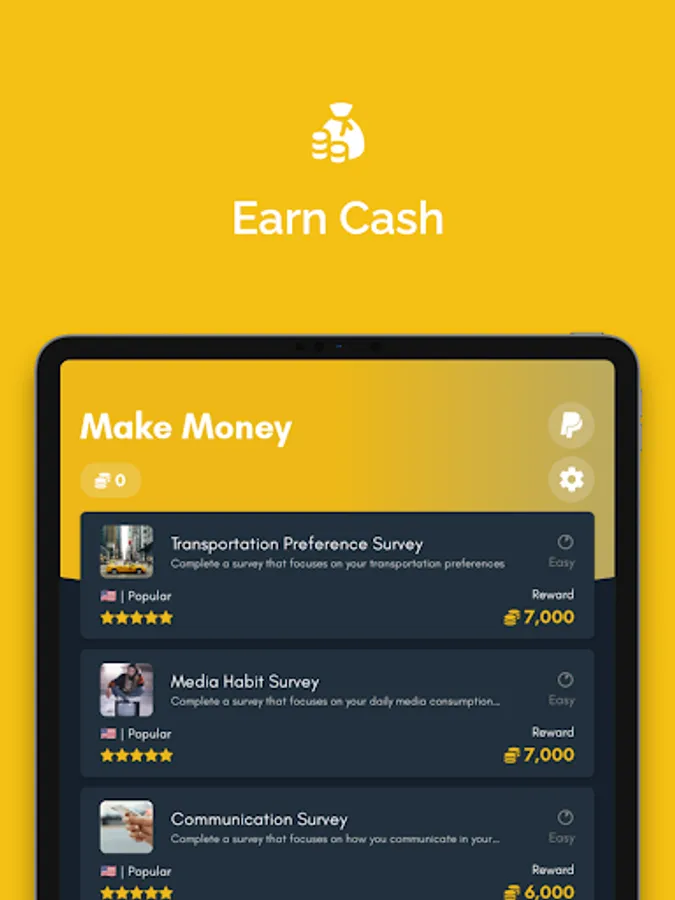 Are you constantly looking for new rewards apps? Make Money helps you earn real cash. First, collect credits by trying free apps, testing services, completing surveys and giving your opinion. Make Money gives you hundreds of thousands of credits, where other cash apps just give you one thousand. The difference in credits is incredible. We have the best high paying offers and high paying surveys. Next, withdraw the credits as free money to your PayPal account. Every credit is worth real money with fast payment through PayPal. Welcome to the reward zone. Say hello to your big rewards. No flimsy gift cards. Real cash money transferred with PayPal. It is that easy to work from home.