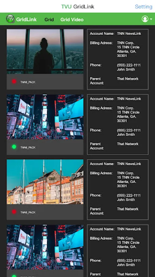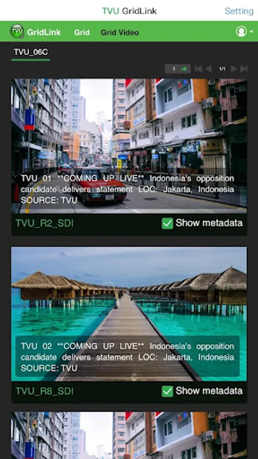 TVU GridLink provides a thumbnail and metadata description of available TVU Grid live news sources.