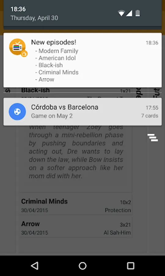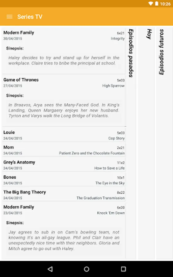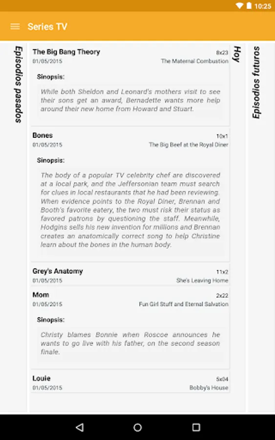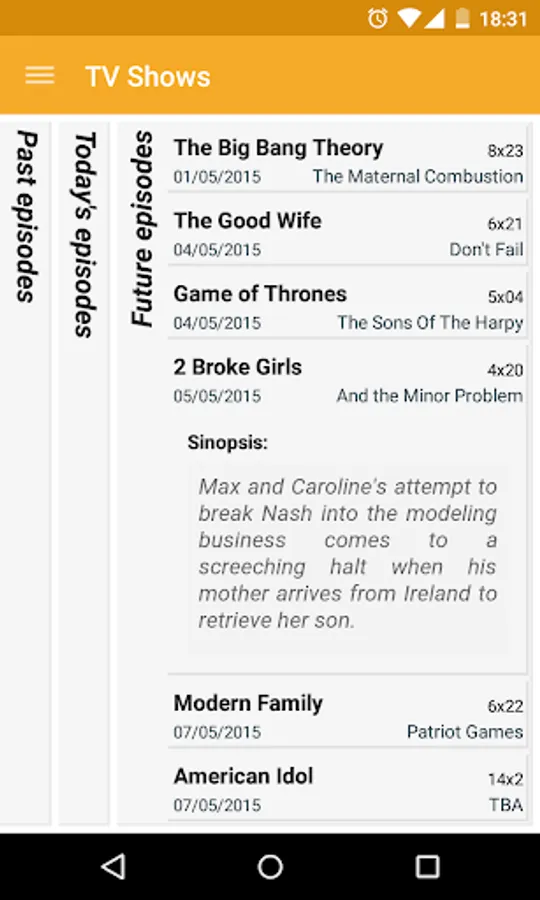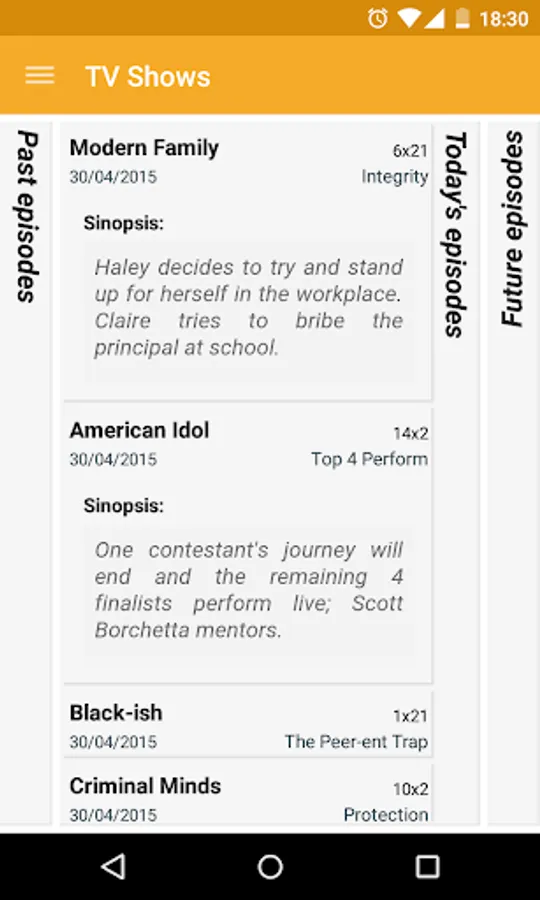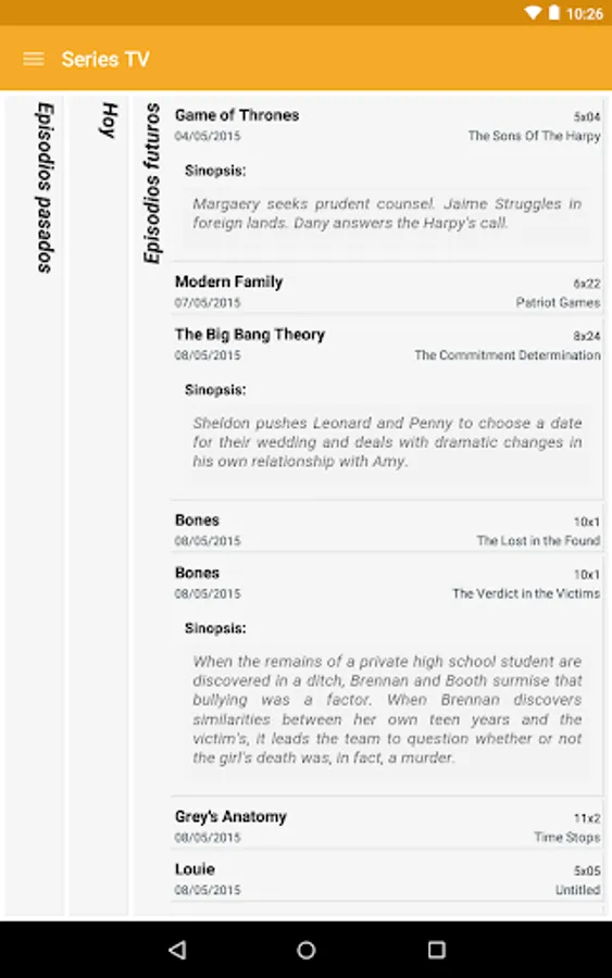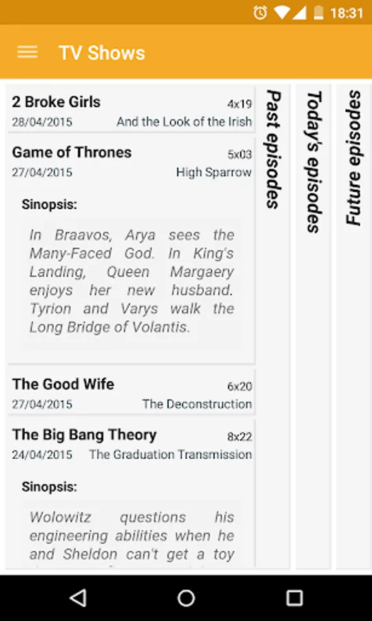 With TV SHOWS you will be able to subscribe to your favorite TV shows of any platform, TV, Netflix, Amazon Prime Video, Hulu, etc. and it will automatically set a schedule with the episodes recently aired, the episodes for today and the future ones. It also provides a detailed description for each episode including a brief sinopsis in order to not miss a detail of the plot!