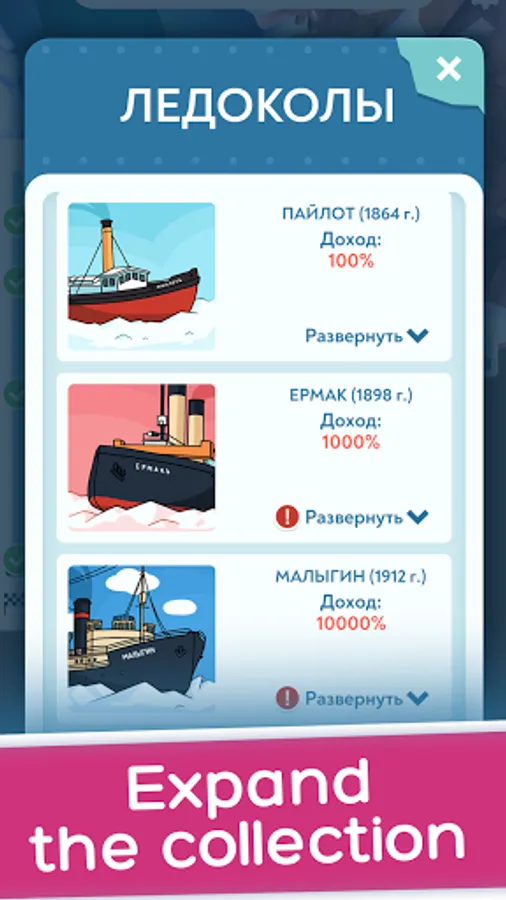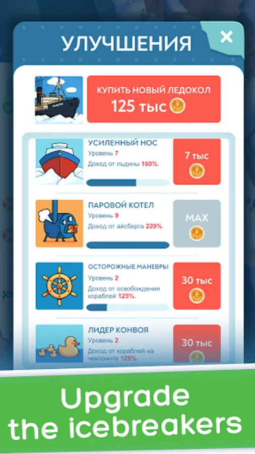 Tap-tap-tap! Click and crush ice, smash icebergs with a cool soundtrack and watch how your income grows. For every piece of cracked ice, you get money. Spend them on new icebreakers and improvements, explore new territories.