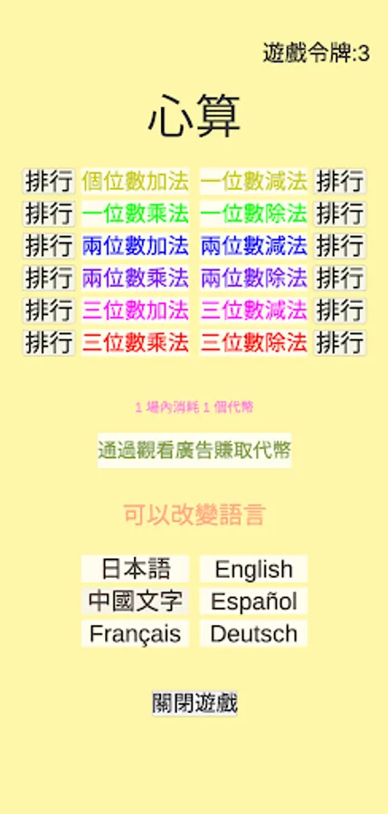The difficulty level is from 1 to 3 digits, and there are 12 stages of addition, subtraction, multiplication, and division.