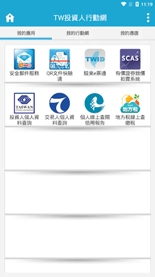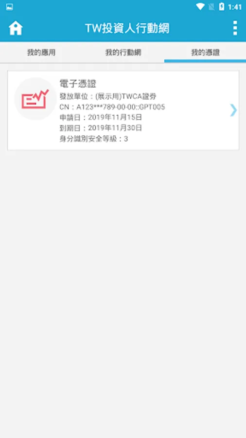Taiwan investor browser provides the service to help investors use kinds of applications with mobile certificates, ie: fund sales, stock trading etc. You can refer to Taiwan investor browser official website ( (http://www.twca.com.tw/twid) to get further information.