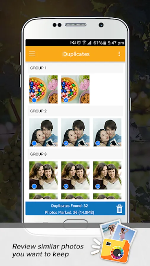 After scan, duplicate photos are categorized in groups for easy viewing, allowing you to effortlessly delete the ones you don’t need.