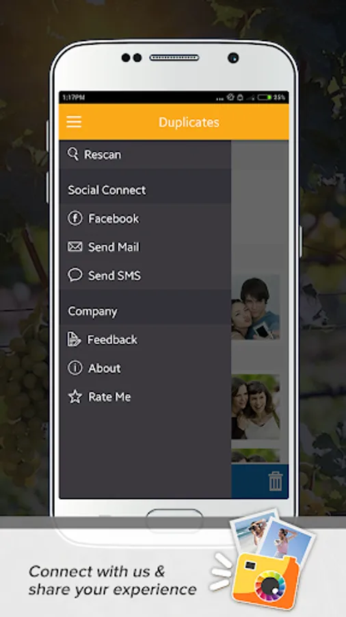 ● Full Scan:Your entire phone is scanned for duplicates, including internal & external storage (if available). If you receive photos on any messaging app, they are scanned too. So you don’t have to worry about finding them manually.