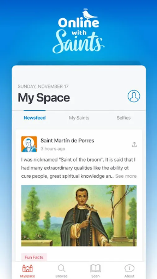 Imagine you could meet and greet a saint, which saint would you choose? The app “Online with Saints” offers a virtual encounter with saints from all around the world. Women and men, carpenters and scholars, mothers and popes, princes and paupers: their inspiring life stories are linked to real life modern questions, and together with them answers are found. Frequently, new saints are added.