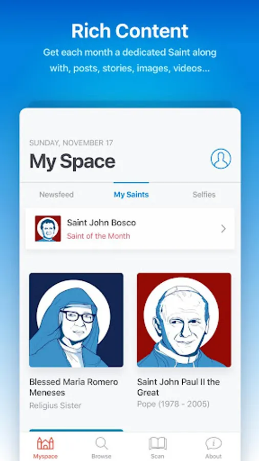 The app contains many saints, with interesting facts, quotes, prayers, and captivating stories of personal faith, love, and sacrifice. You can even take a selfie with the saint of choice. Obviously, it is possible to share discoveries on social media. Also, you can personalise the app through your Online with Saints profile.