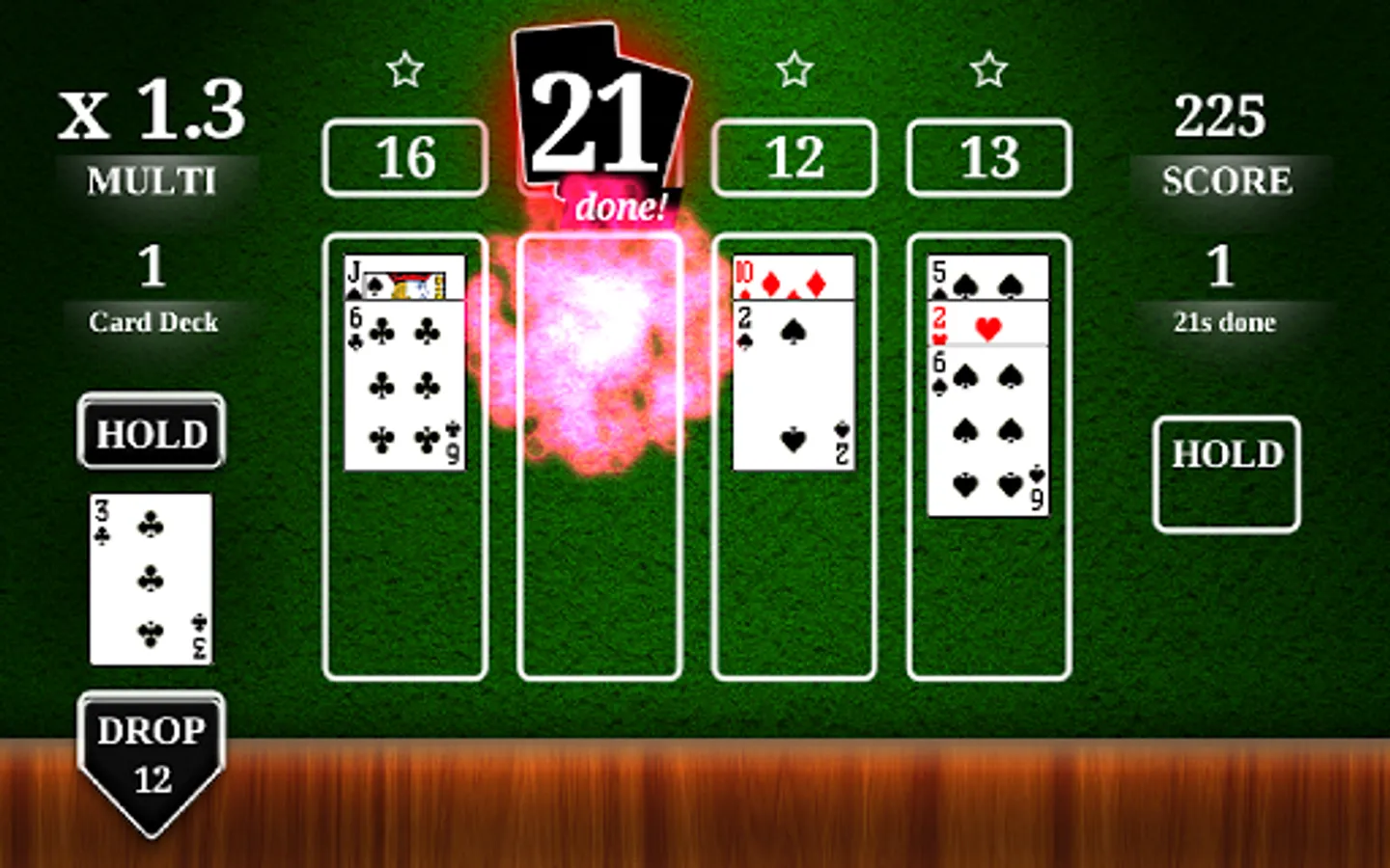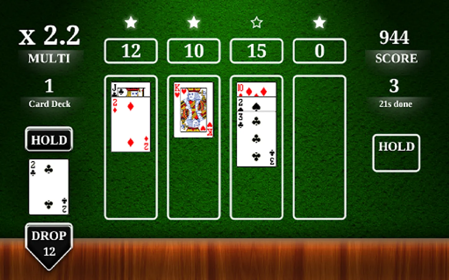 Simple card game. Place the poker cards on 4 stacks - reach 21 to complete (similar to Black Jack).