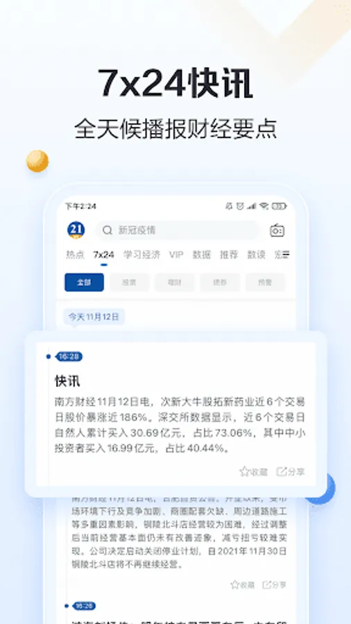 21 Finance Client is the official client of China Southern Finance All Media Group, and was selected as "Innovative Cases of China's Newspaper Industry Intensive Integration Development in 2020". As a mainstream financial media, the content of the 21 Finance client closely revolves around the group’s four core businesses of “media, think tank, data, and trading”, and fully integrates the group’s “21st Century Business Herald”, “Economic Science and Education”, and “Stock Market Broadcasting”. Financial media resources, to achieve full coverage of text, pictures, video, audio, live broadcast and other content forms. We have successively launched innovative products such as the Learning Economy Channel, Nancai Account, Data Channel, City Link, and Licai Link to create a professional financial client with diverse news formats, professional and easy-to-understand content, powerful product functions, and better user experience.