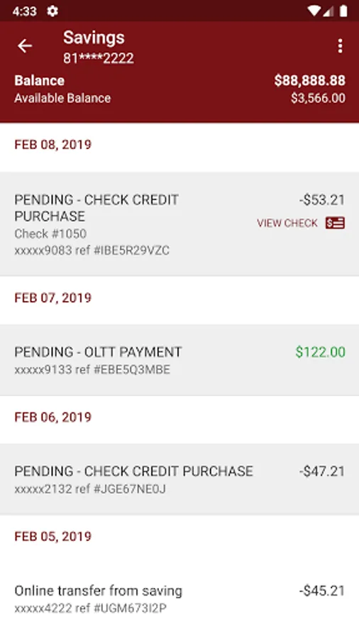 • View your account balance and search recent transactions by date, amount, or check number,