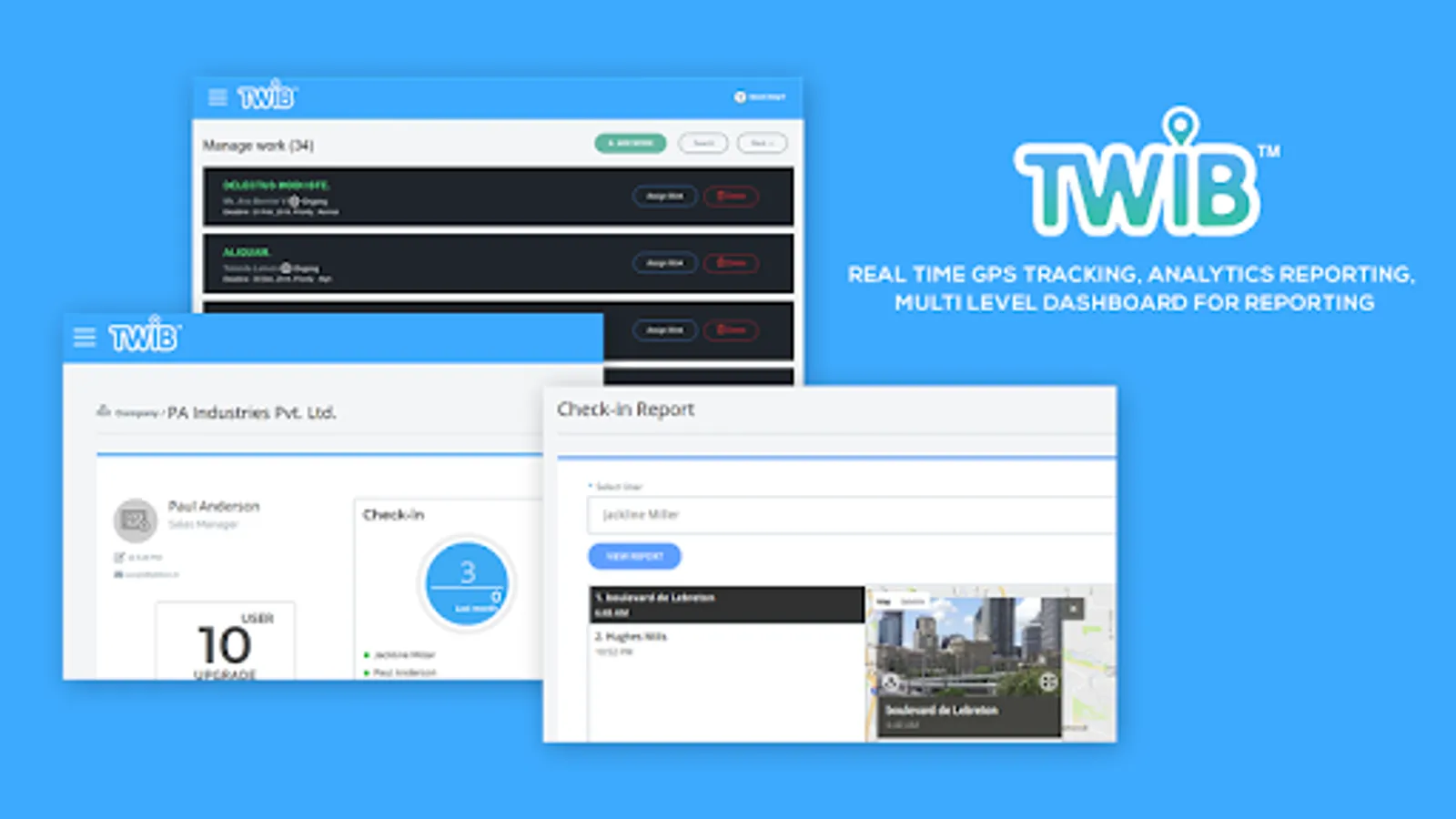 Twib is a sales tracking and sales reporting app for business owners & salesmen offering a web-based (https://twib.online) admin panel to track GPS location of sales employee activity, where you can monitor the day to day activities of your sales team by capturing the real data from their location with sales GPS tracker. It helps the company and the sales personnel in the field to track sales visits and reporting more efficiently with images.