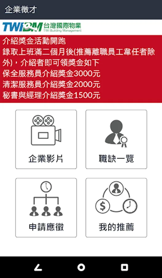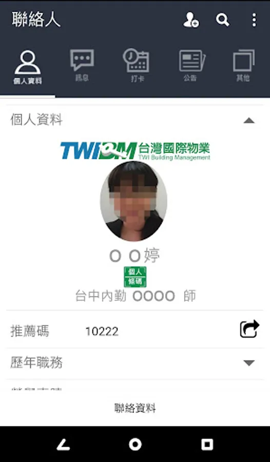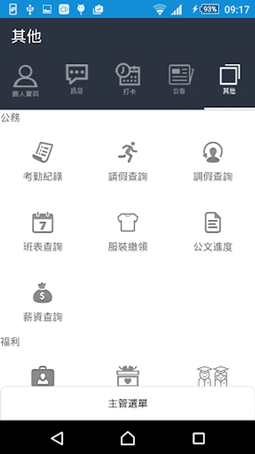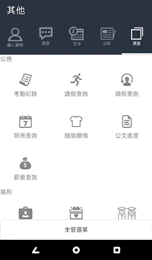 功能: 通訊簿,Beacon考勤打卡,考勤記錄, 請假查詢, 調假查詢, 班表查詢, 服裝繳領, 薪資查詢,公文進度等