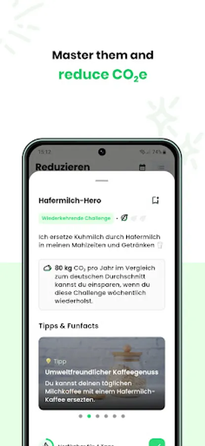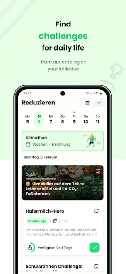 More than 160 climate challenges focus on different topics of everyday life. For completing a challenge you receive valuable climate points. Of course, all challenges include detailed information texts that explain the circumstances and effects of the challenge in detail. The data is always up to date thanks to cooperation with Worldwatchers, Frauenhofer.iee, the Wuppertal Institute and the University of Kassel.