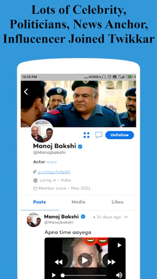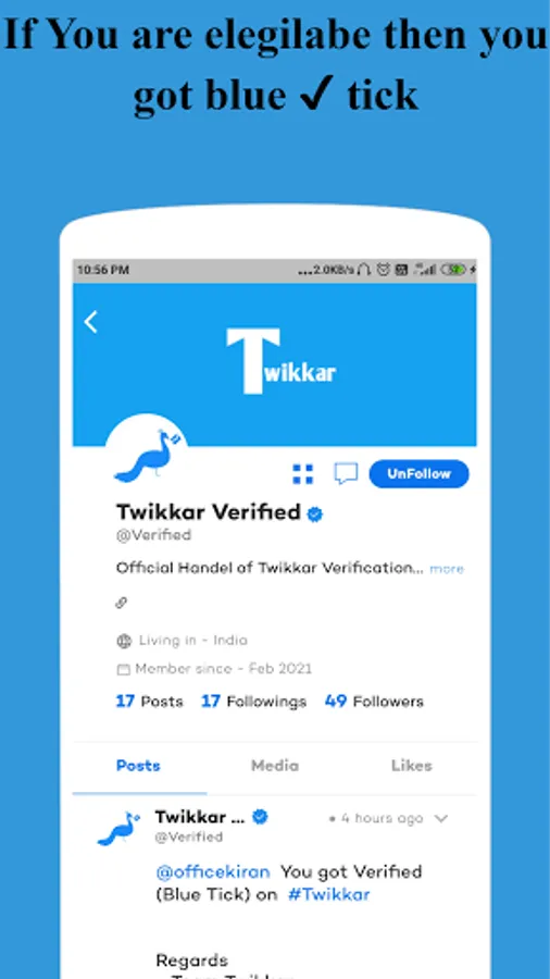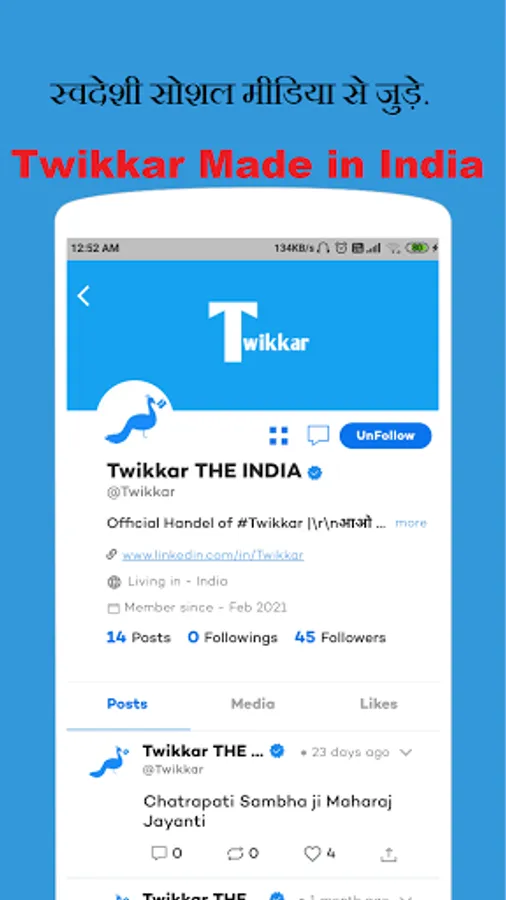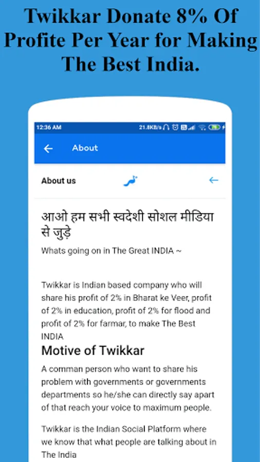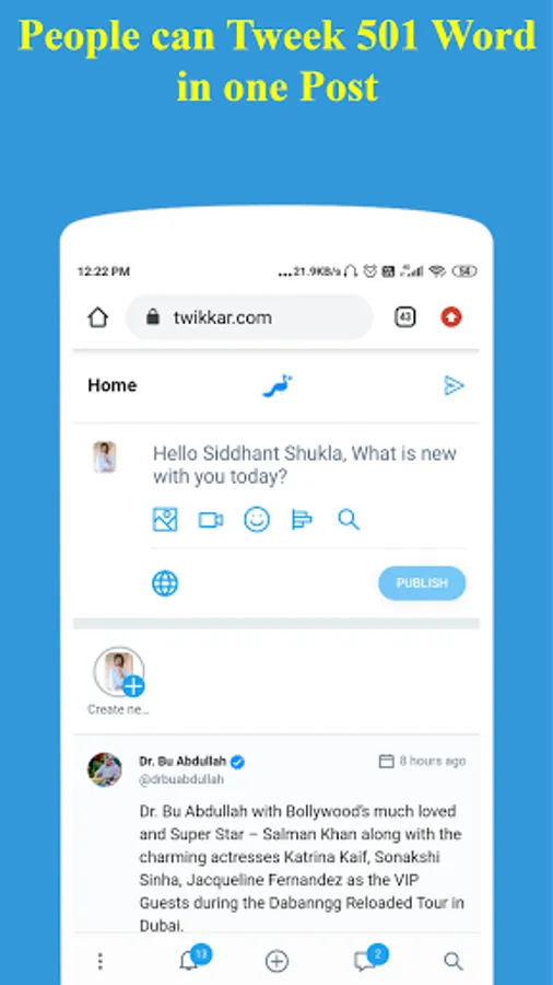 Welcome to Indian Social Media Platform, In Twikkar You can write 501 word in one post, 10 pics in one post and most fanstatic featues is when anyone visit your profile you got notification immeditaly.