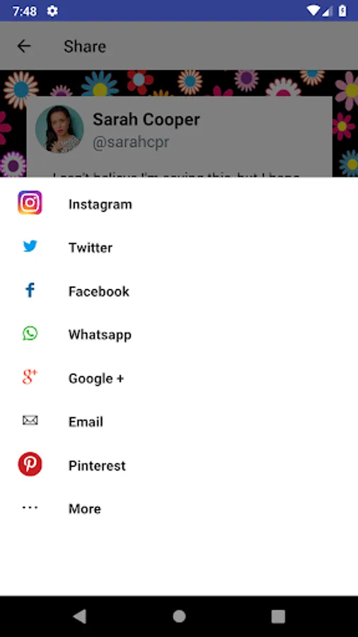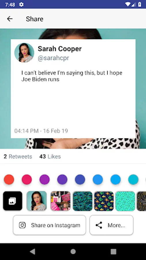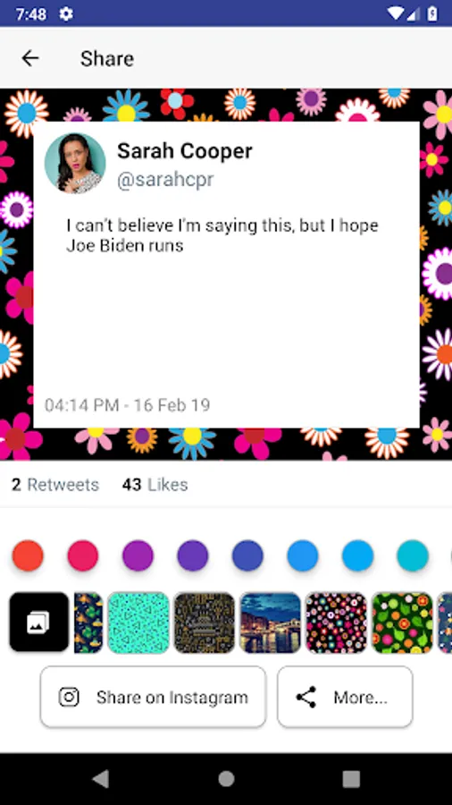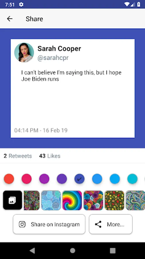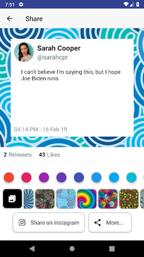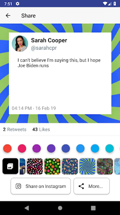 Detailed usage: Choose a twitter user or share a tweet from twitter, then select a tweet to convert to an image, then select a custom color, custom background or creative background, and share to instagram/another site/save to your device.