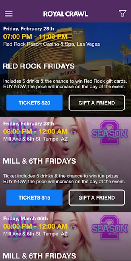 The future of nightlife has arrived with the Royal Crawl! Whether you’re a local looking for a fun night out with friends or a visitor looking to bar-hop in a new city, use the Royal Crawl app for a fun and action-packed night. Check-in at each bar, redeem your drink, and collect a digital playing card to build your poker hand. The best hands of the night win prizes. Great for birthdays, bachelor(ette) parties, and private events.