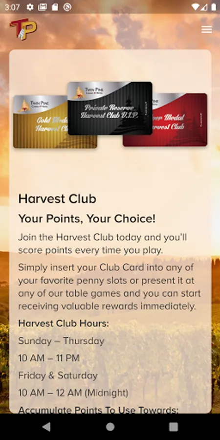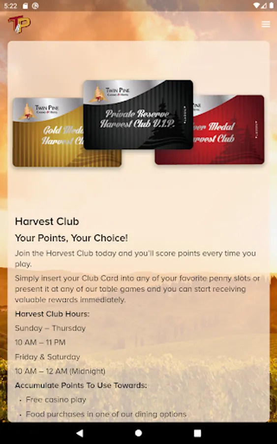 Twin Pine features exciting gaming action with the latest and most popular Vegas style slot machines as well as live table game action including Black Jack and 3 card Poker. Our smoke-free hotel offers first class accommodations with 59 deluxe rooms and suites. Our Harvest Club is known to locals as the “Millionaires Club” as we have made more Millionaires than any other Casino in Lake County.