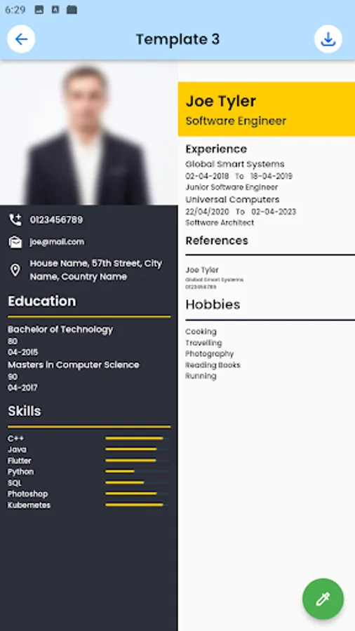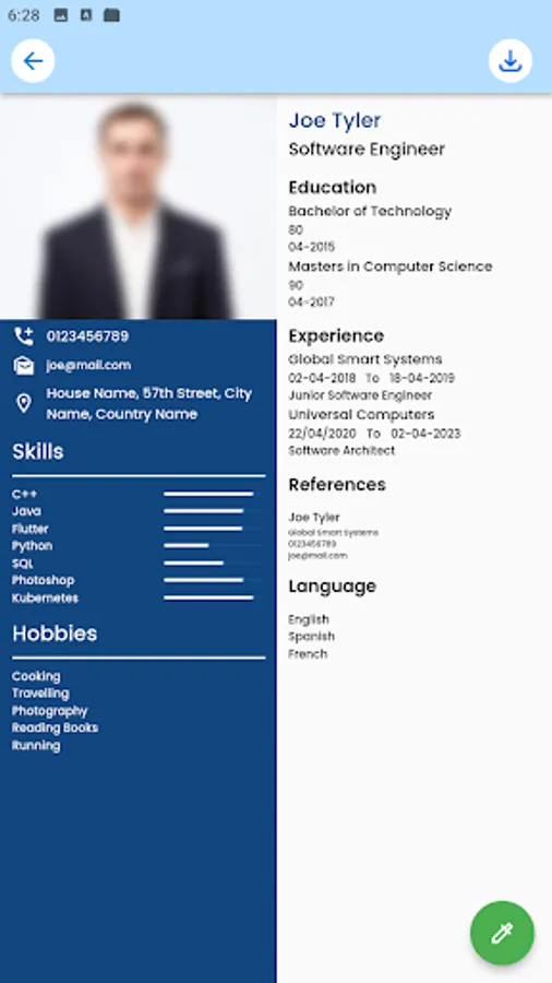 With our easy-to-use interface, creating a top-notch resume has never been simpler. Our app is designed to help you add all the essential details, such as your personal information, education, skills, hobbies, languages, and references. Once you've entered all your details, you can choose from our wide range of beautifully-designed templates to create a professional-looking resume that's sure to impress.