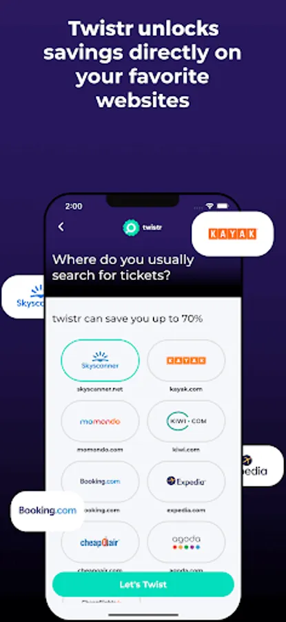 -Browse your favorite travel website from within Twistr: Skyscanner, Kayak, Momondo, Booking, Kiwi, and much more!