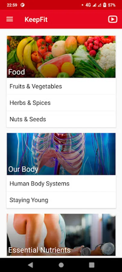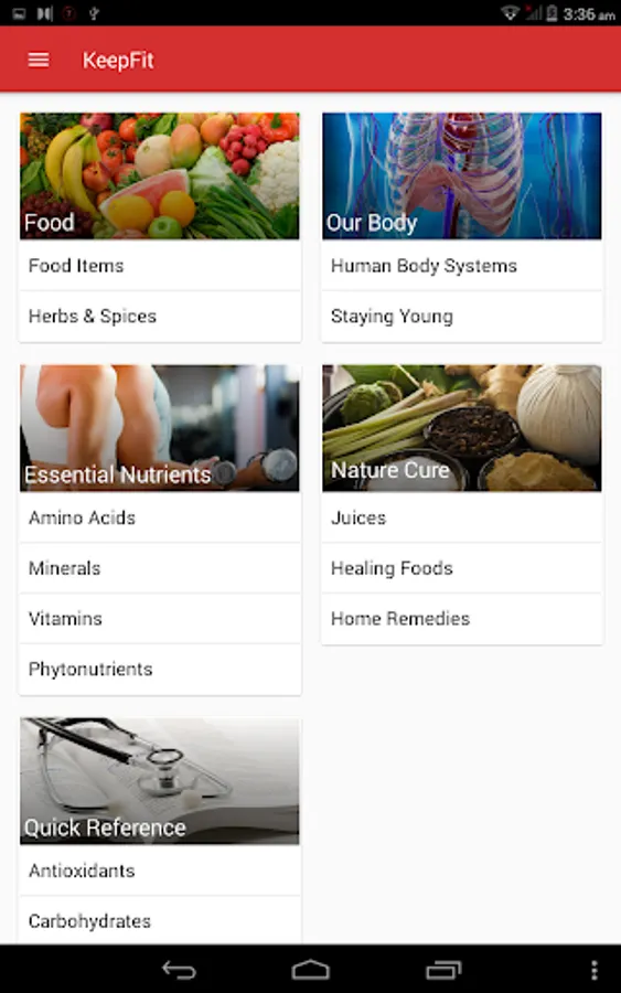 KeepFit is a rich collection of Facts and Tips that will familiarize you with the Benefits and Use of Nature Cure with Natural Food. The application not only contains facts about the Nutritional value of various food items but also contains information about the usefulness of food in the treatment of various diseases and health problems.