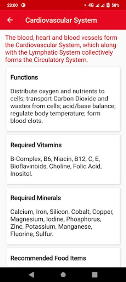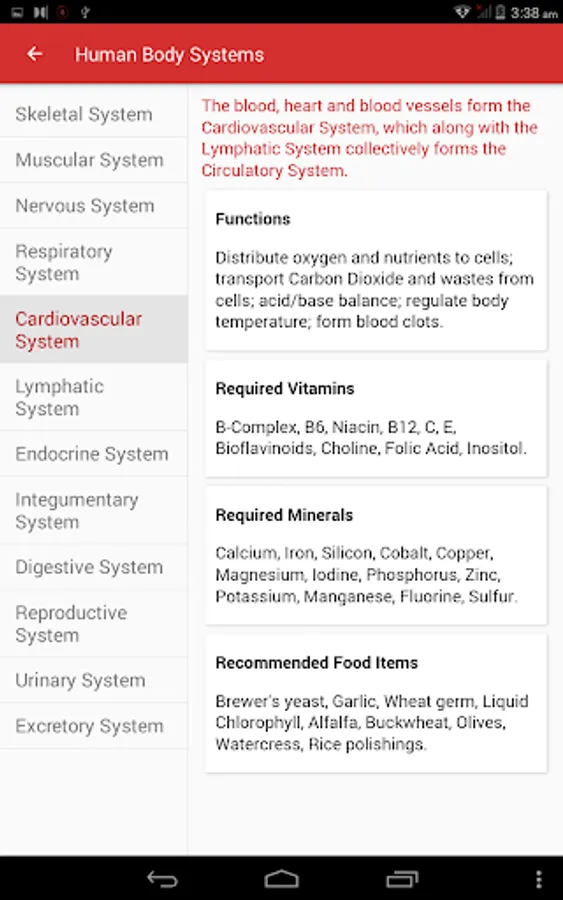 * Functions, Required Vitamins, Required Minerals and Recommended Food Items for the 12 systems of the Human Body.