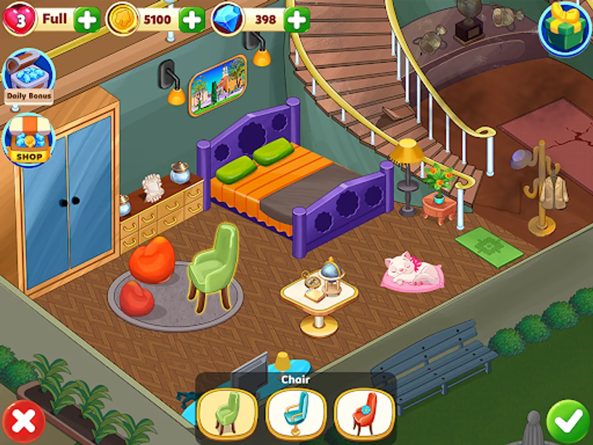 In this dream home match and renovation games, you can completely design new home furniture and decors of your choice and challenging hundreds of match 3 puzzles. Isn’t it a perfect merge and design your dream house game?