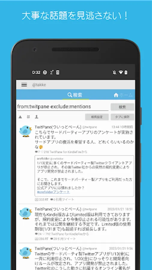 - The following features of TwitPane are not included because they are against Twitter's developer terms of use.