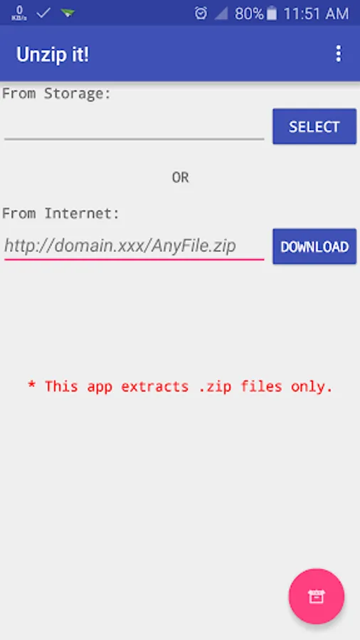* Note: This app extracts .zip files only. Also, this app can not extract protected files.