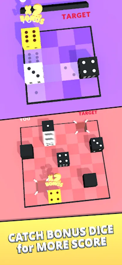 Roll your dice between dark dices into the maze for reaching your target. Black dice are located inside a maze for you to score points. Be careful! Once you interact with a black die, you cannot interact with it again! Sometimes you will see bonus dice in the maze, and if you are quick to interact with them, you can earn extra points. There will also be elements that will help you score more inside the maze.