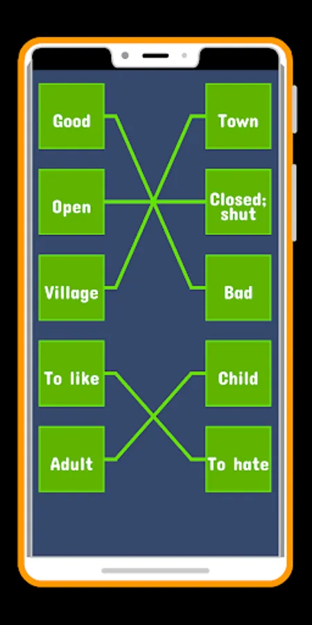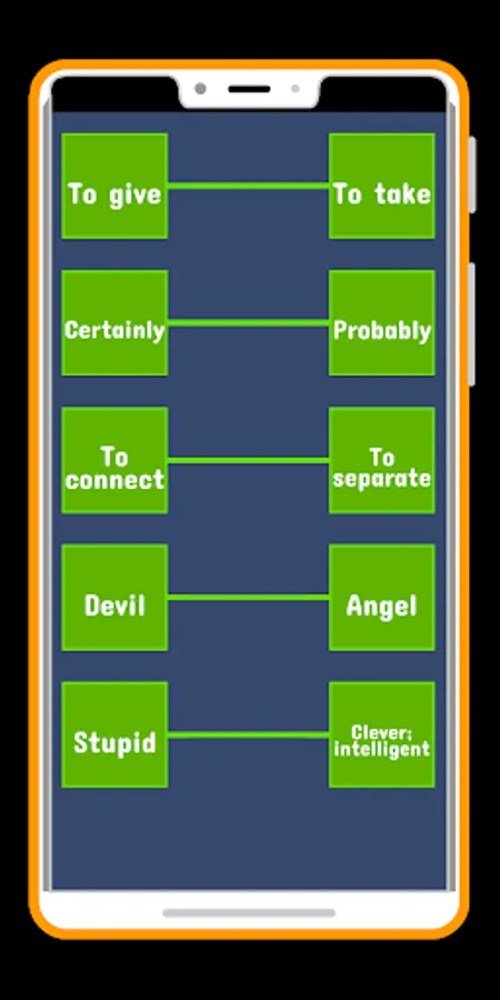 Suppose you have knowledge of 4 words in the level and you don't know the fifth word, So this game will help you to learn new words, because if you connect four words to another four words, there are remaining two words. The both remaining words will match with each other, hence you will learn new words at each level. There are some simple words and also hard words.