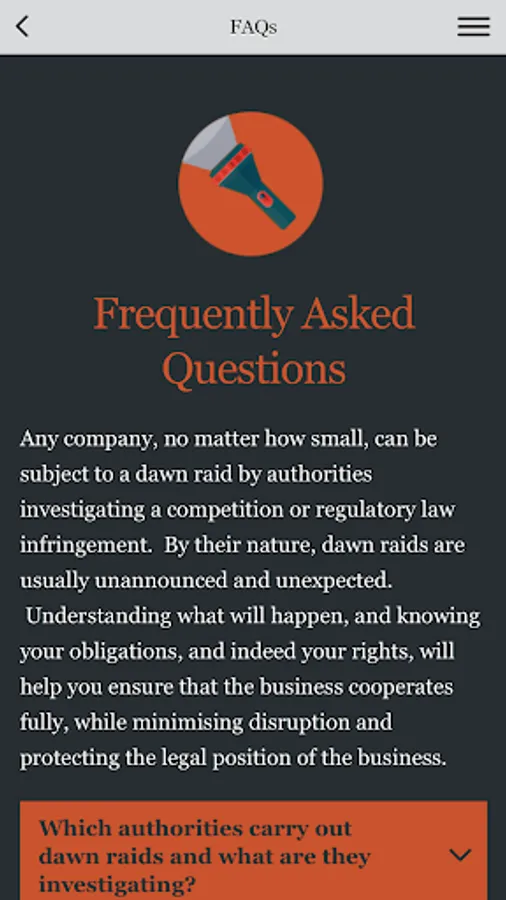 The Bird & Bird Dawn Raid app is designed to give you key information for before, during and after a dawn raid. It covers your obligations and rights, allowing you to minimise disruption and protect your business. The app also features frequently asked questions and emergency Bird & Bird contacts to provide clients with support at their fingertips.