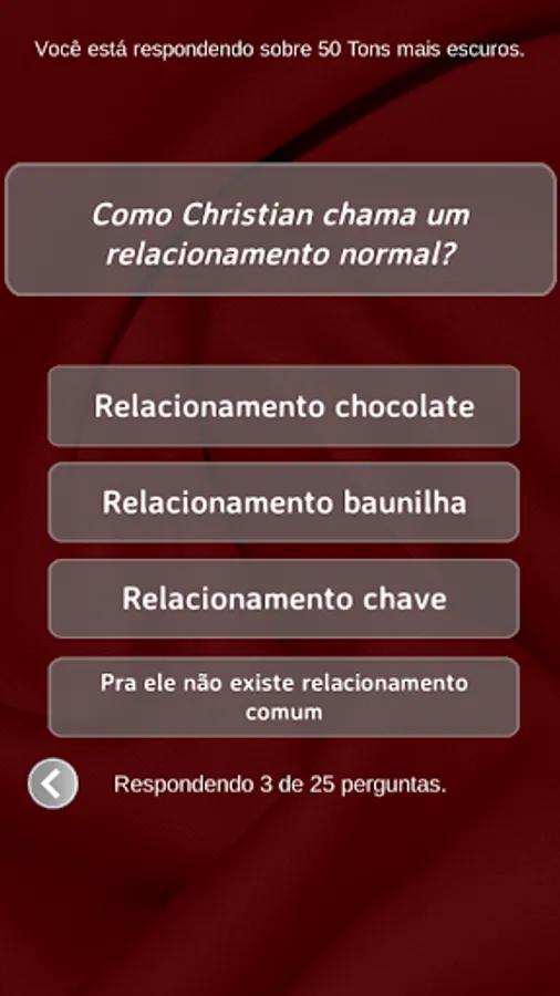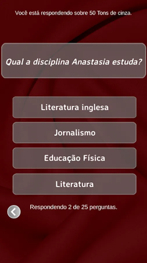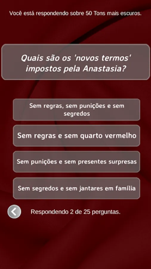 The 50 tones quiz is a game of questions and answers with various topics related to Mr. Gray trilogy., Perfect to enhance and test your knowledge of the film and books in a very fun way.