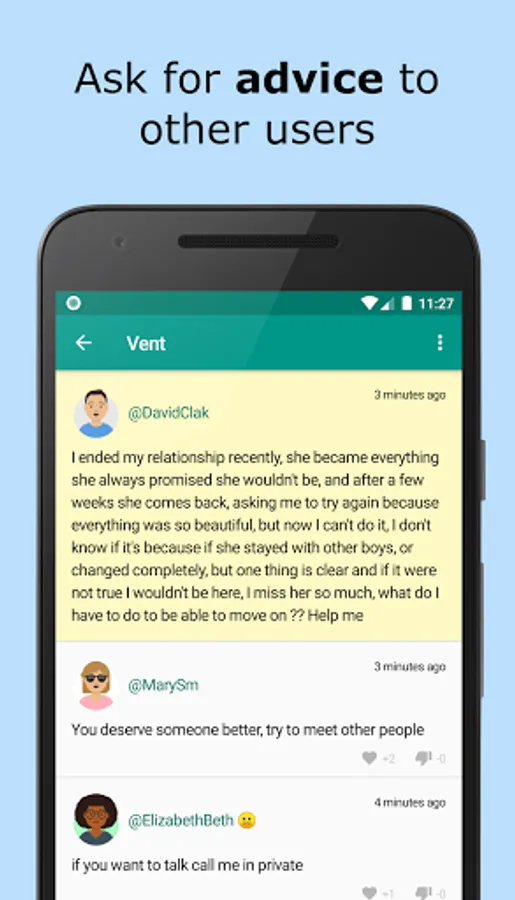 Meet new virtual friends and interact anonymously, besides venting and asking for advice, you'll be able to make new friends and talk about all your problems and joys.