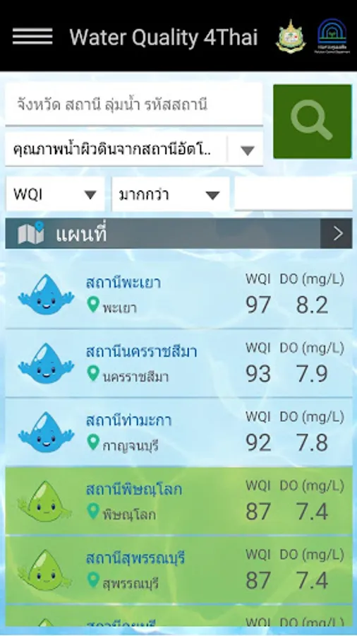 Thai Water Quality app use for report the Thailand water quality information. You can view Surface Water Quality from Automatic Stations, Surface Water Quality from Manual Sampling and Marine Water Quality from Manual Sampling.