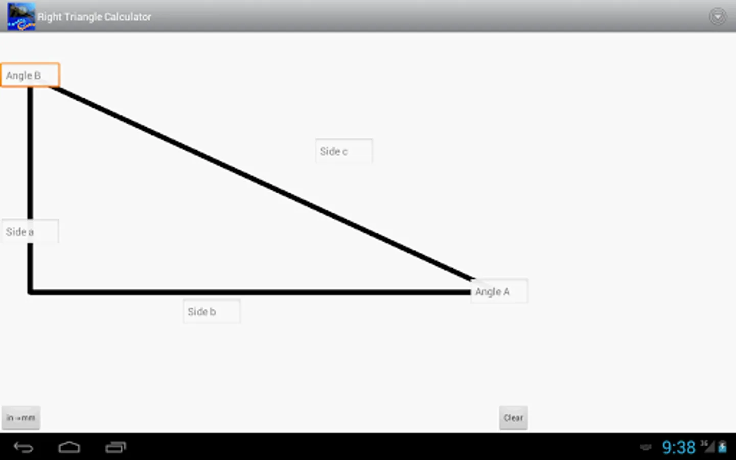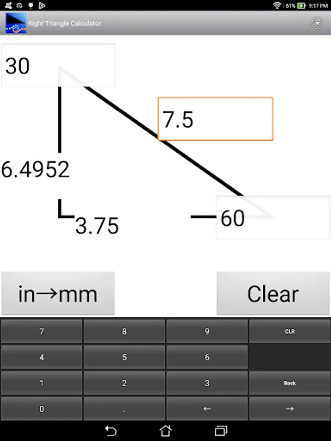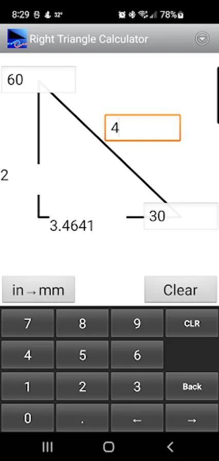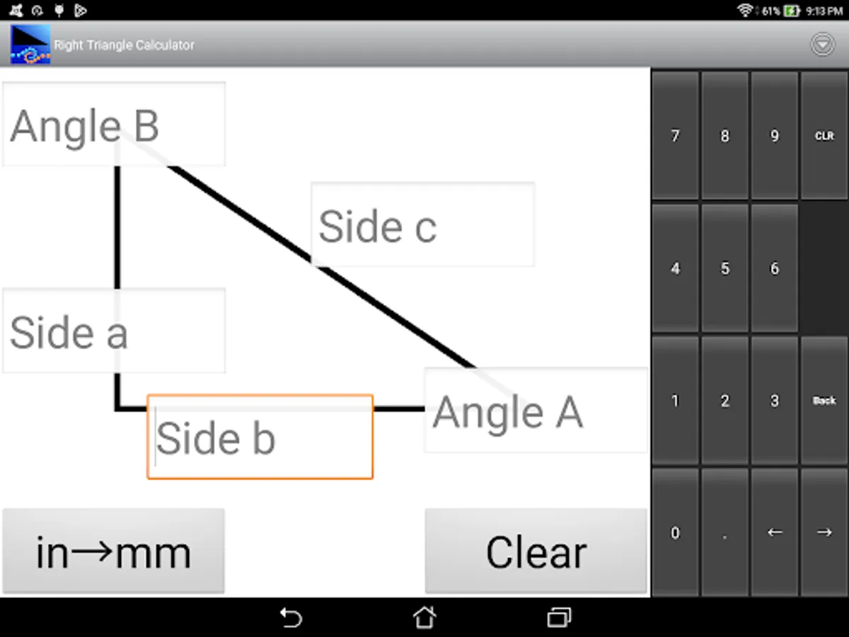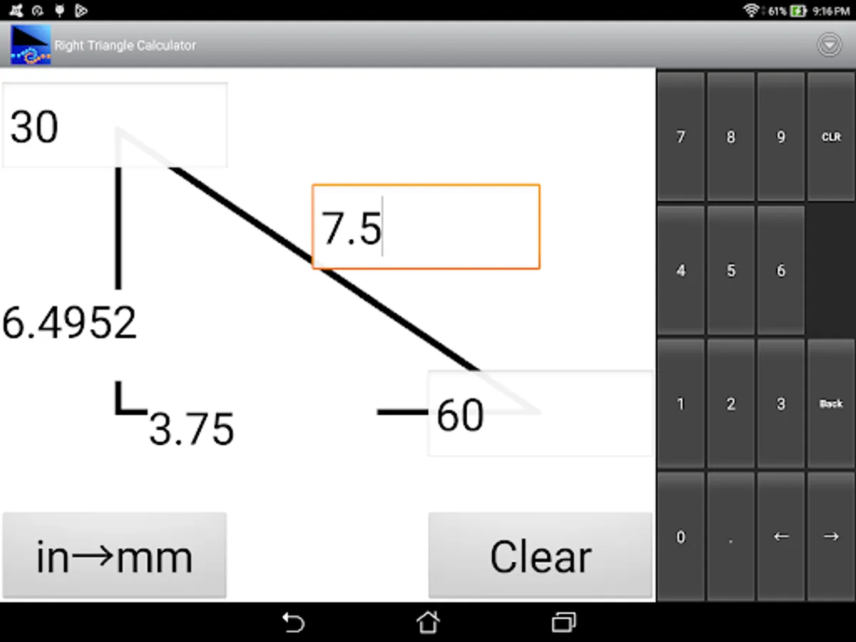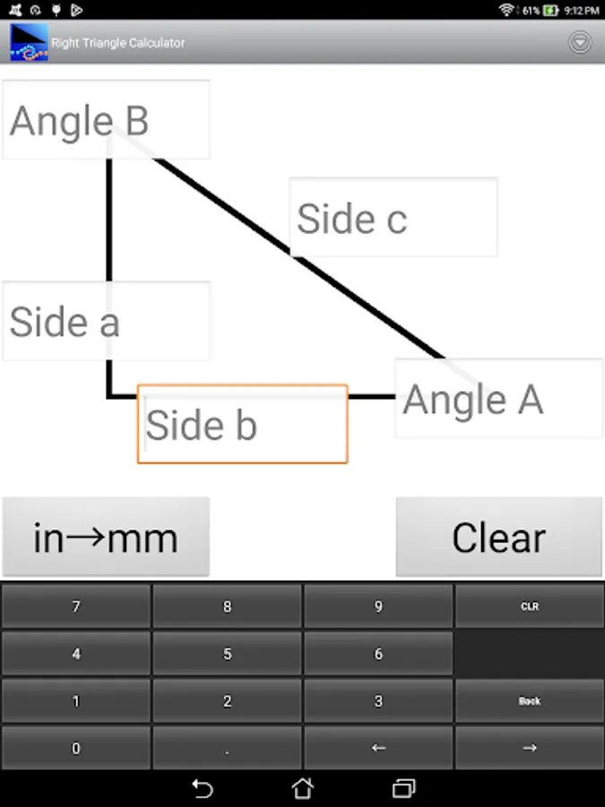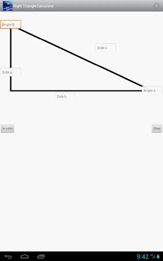 This is an easy to use calculator for solving right angle triangles with settings to customize the number of decimal places to display. Touch and hold on a calculated number to copy to the clipboard.