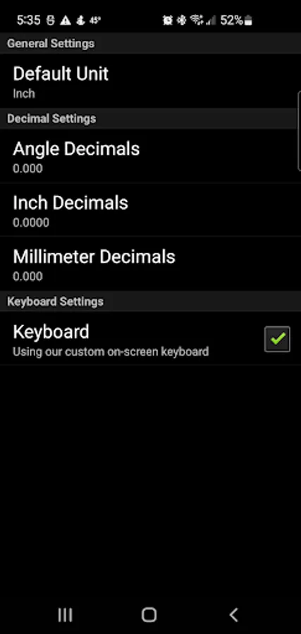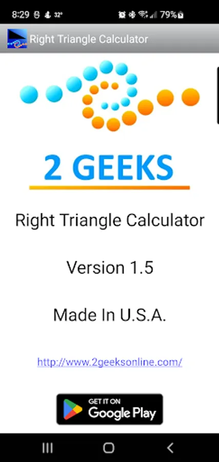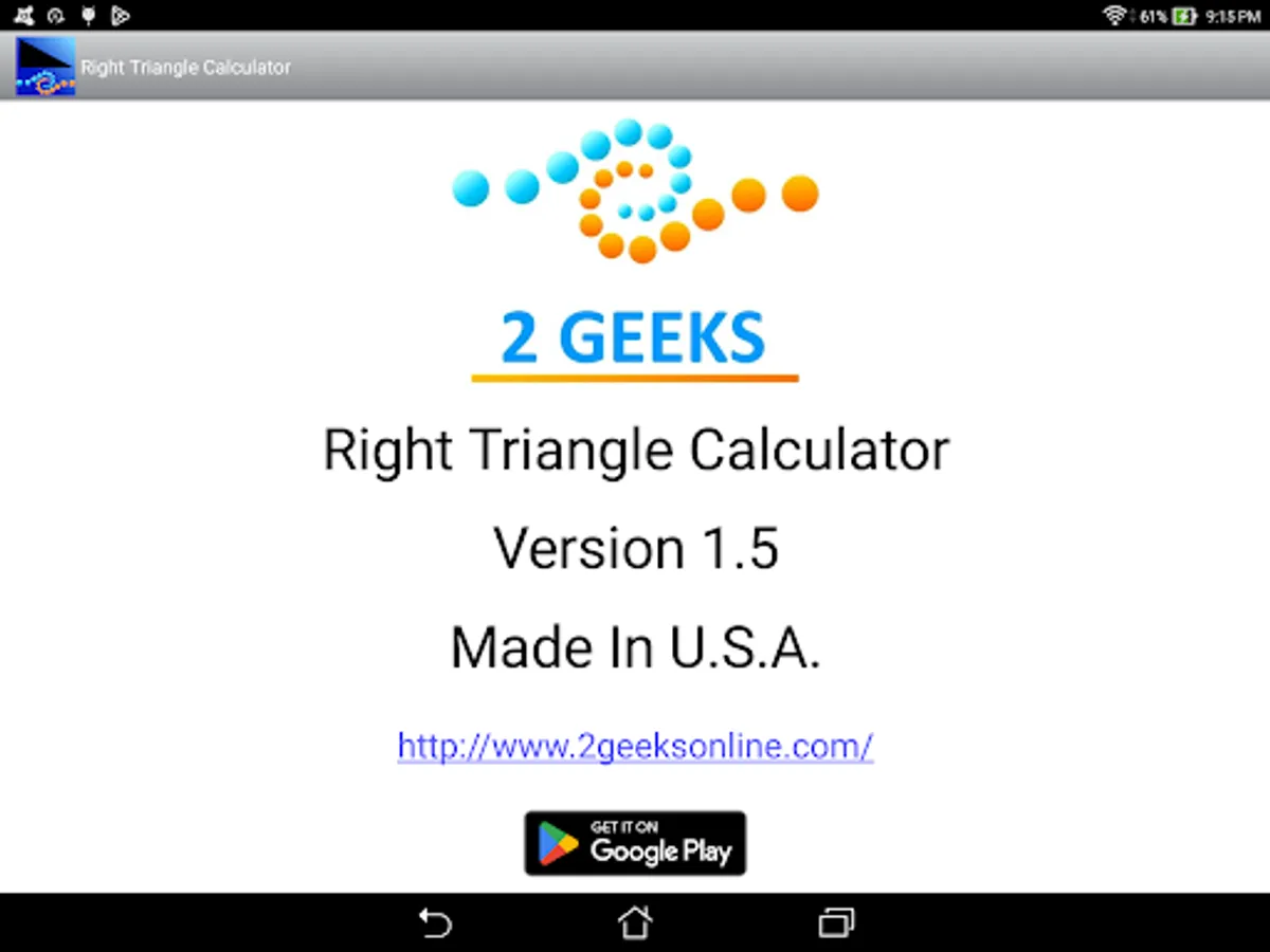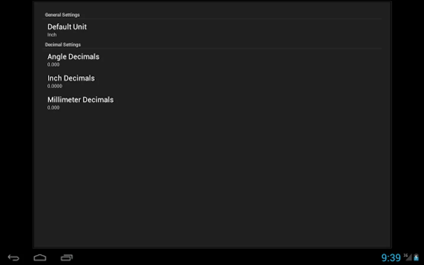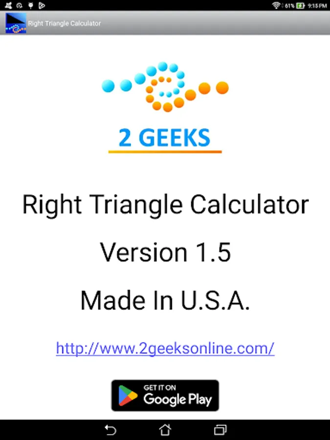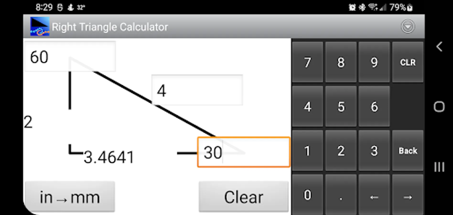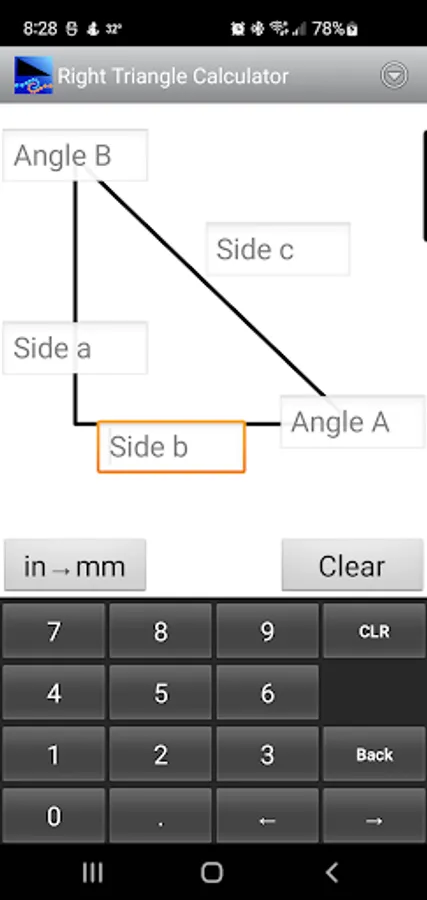 This is an easy to use calculator for solving right angle triangles with settings to customize the number of decimal places to display. Touch and hold on a calculated number to copy to the clipboard.