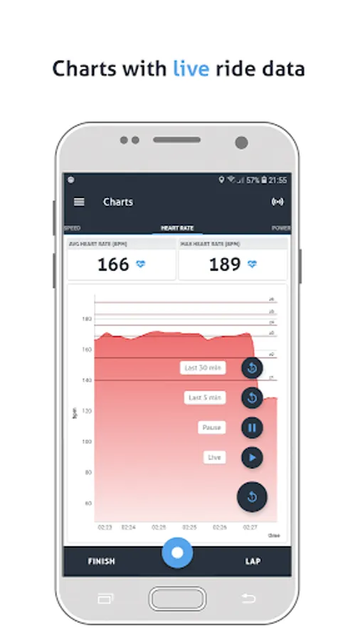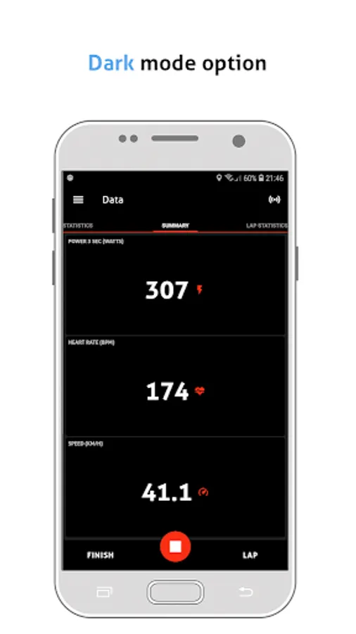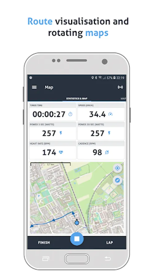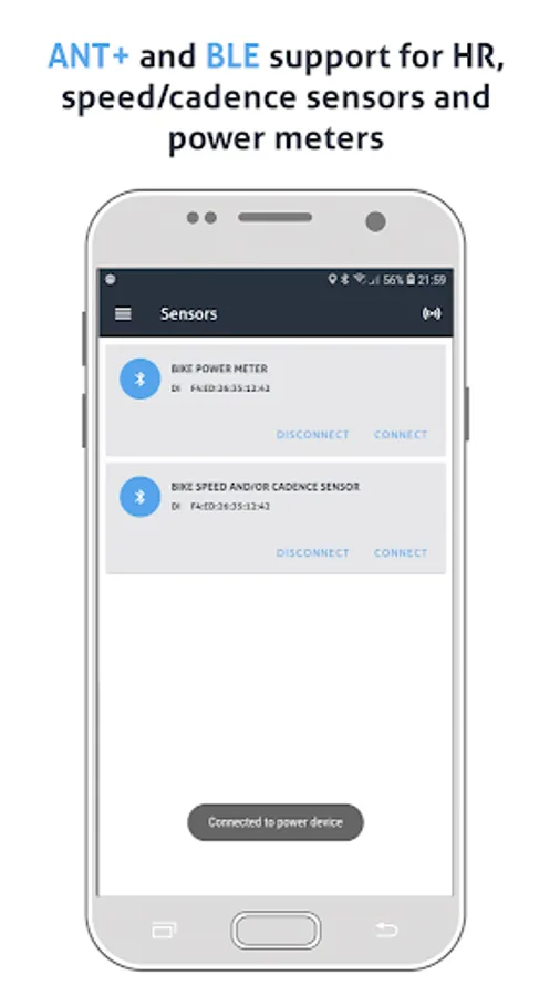 You can easily connect to your ANT+™ or Bluetooth cadence, heart rate, speed and power meters sensors (ANT+™ sensors requires ANT+™ hardware support on your smartphone, Bluetooth sensors require Bluetooth low energy support). Your ride data will be stored on your smartphone as a FIT file.