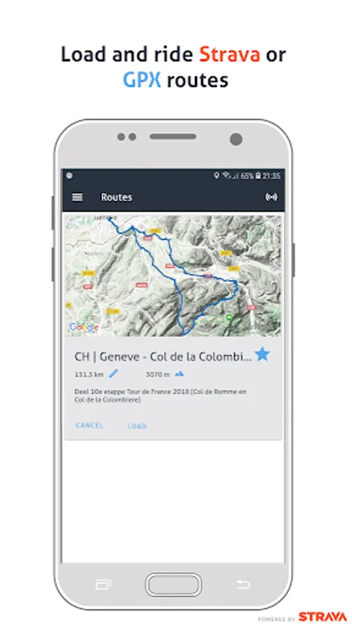 Load GPX tracks or Strava routes which will be shown on the map such that you can easily follow your route (no turn by turn navigation). You can choose to either use Google Maps or Openstreetmap (Openstreetmap supports offline maps and has more functionalities).