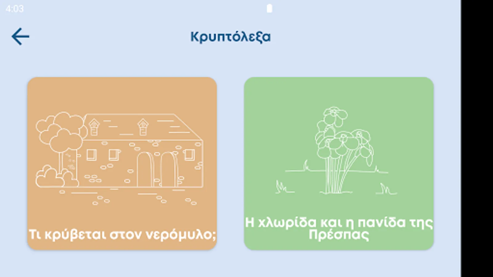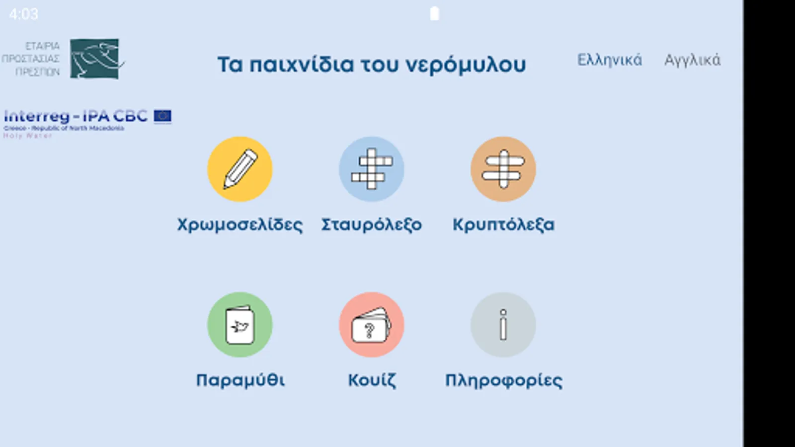 The Watermill Games application includes fun activities for children, through which they can learn about the functions of the watermill of Agios Germanos, its connection with the natural environment, but also to get to know better the Prespa area and its rare flora and fauna.