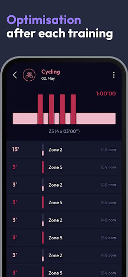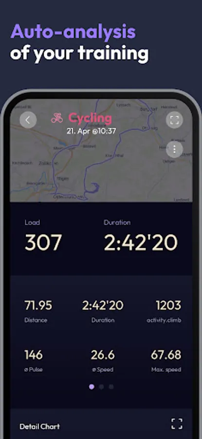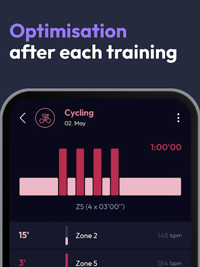 Make the most of your training budget and always train to the exact extent your body needs. The plan analyses your performance and automatically sets the amount and intensity of training. Furthermore, the intensity of completed workouts is automatically analysed and subsequent sessions are adjusted accordingly.