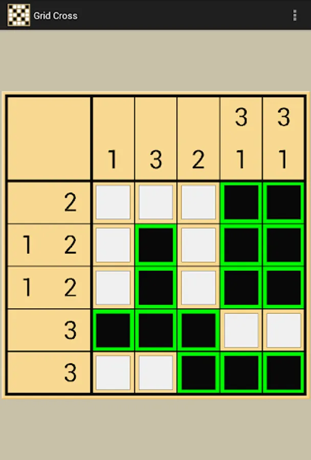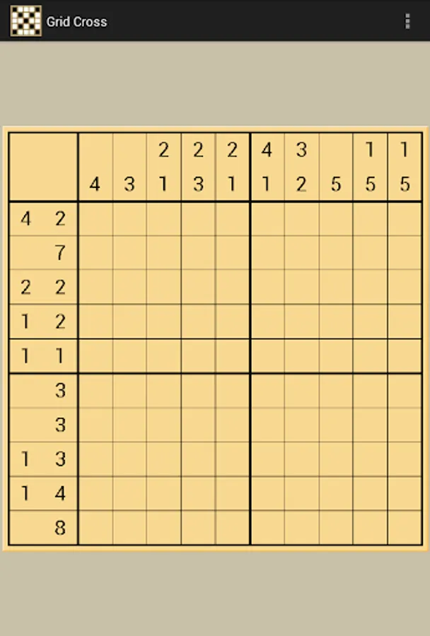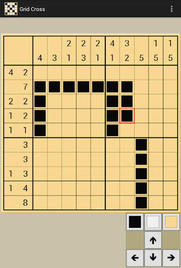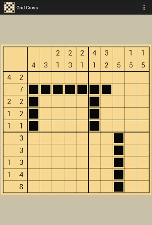 Grid Cross, like Nonogram, is a logic puzzle game that requires each square in the grid to be filled with either a black or white color according to the numbers at the side of the grid. The numbers, given for each column and row, show how many unbroken groups of black squares are in each column and row, as well as the number of black squares in each group formed. A group is separated by at least one white square in between. For example, the clue "4 1 2" means that there are three groups in that order, with four, one, and two black squares in the corresponding group, with at least one white square between the groups. There is only one possible solution for each game pattern.